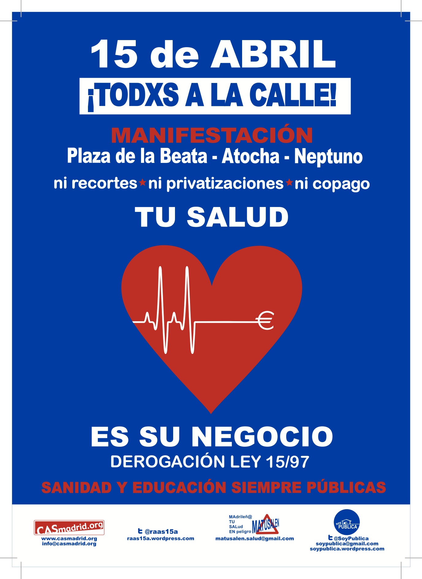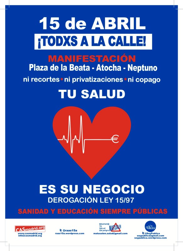 Tod@s los que luchamos por la Educación Pública, estamos invitados a participar en una nueva MANIFESTACIÓN a favor de de la Sanidad y la Educación el 15 de abril. Porque hay motivos suficientes para lanzarse a la calle y defender lo que es de tod@s.