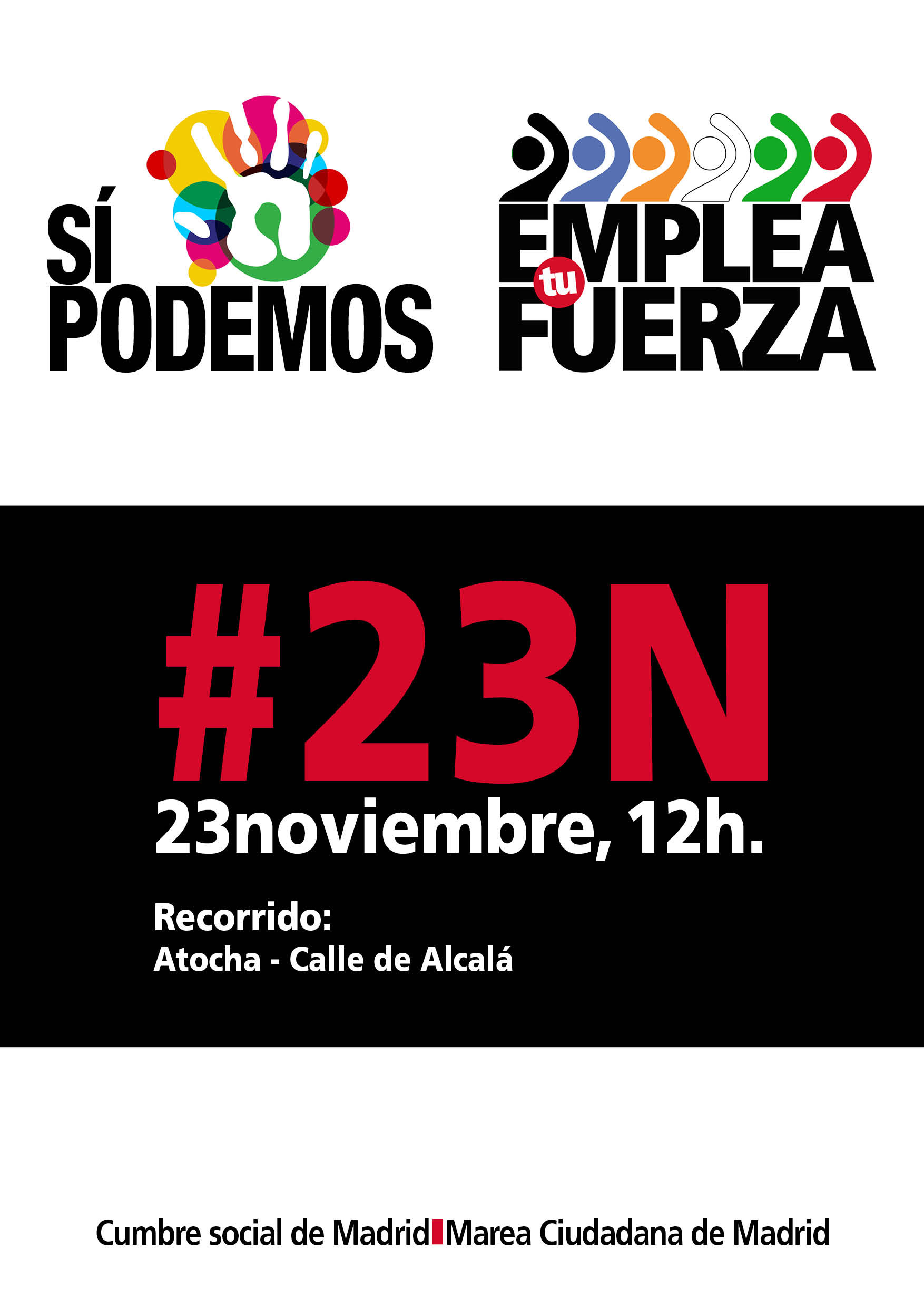 Ante las agresiones que las políticas de recortes llevadas a cabo por los Gobiernos Central, Autonómico y local, que están llevando a la ciudadanía a una desprotección total, vulnerando de manera sistemática los derechos sociales y laborales de los ciudadanos, consideramos necesario dar una gran respuesta manifestándonos el próximo sábado #23N y convocamos a todos los madrileños y madrileñas a participar en esta gran manifestación que tendrá lugar en Madrid.