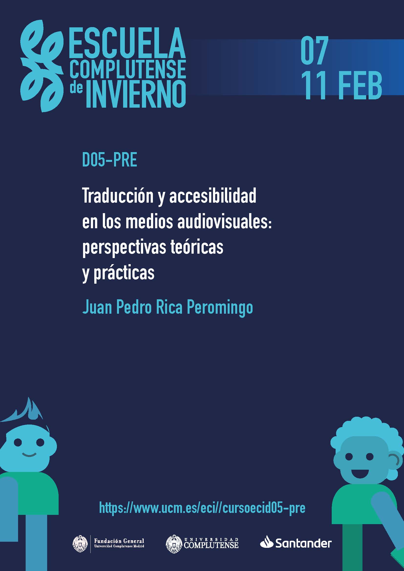 Curso presencial en febrero de 2022 para la Escuela Complutense de Invierno, como actividad del Grupo de Investigación UCM Traducción, Traducción Audiovisual (TAV) y Accesibilidad Lingüística (AL) (TRADAVAL) (970828). El curso pretende ser una aproximación e inmersión al concepto de la accesibilidad dentro del campo de la traducción audiovisual y de los medios audiovisuales desde diferentes perspectivas y áreas: universitaria y profesional. Este curso se llevará a cabo durante cinco días y contará con la participación de profesorado universitario especializado y profesionales activos que presentarán, dentro de su área de especialización, la accesibilidad dentro de los medios audiovisuales y su traducción así como las herramientas y dispositivos que hacen que sean comprensibles y utilizables en distintos entornos. Se contará con seminarios y talleres prácticos para la realización del mismo.